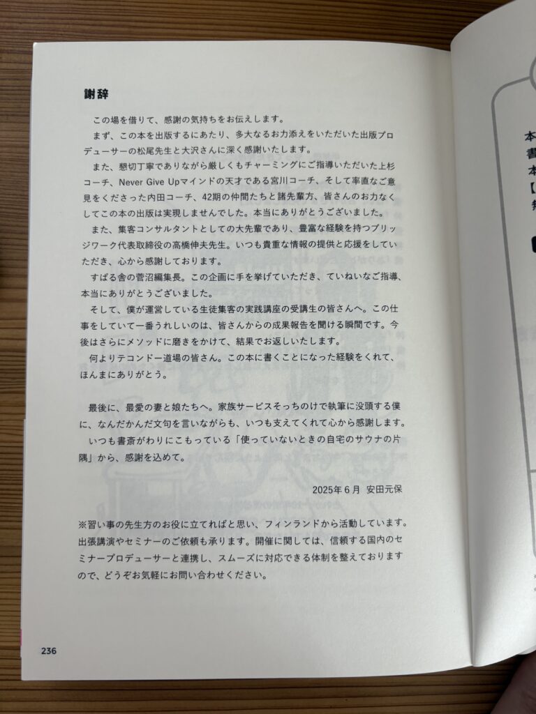巻末の謝辞にも、私の名前を入れてくださいました^^「懇切丁寧でありながら厳しくもチャーミングにご指導いただいた上杉コーチ」とのこと。嬉しいなぁ〜〜^^ ありがとうございます♪