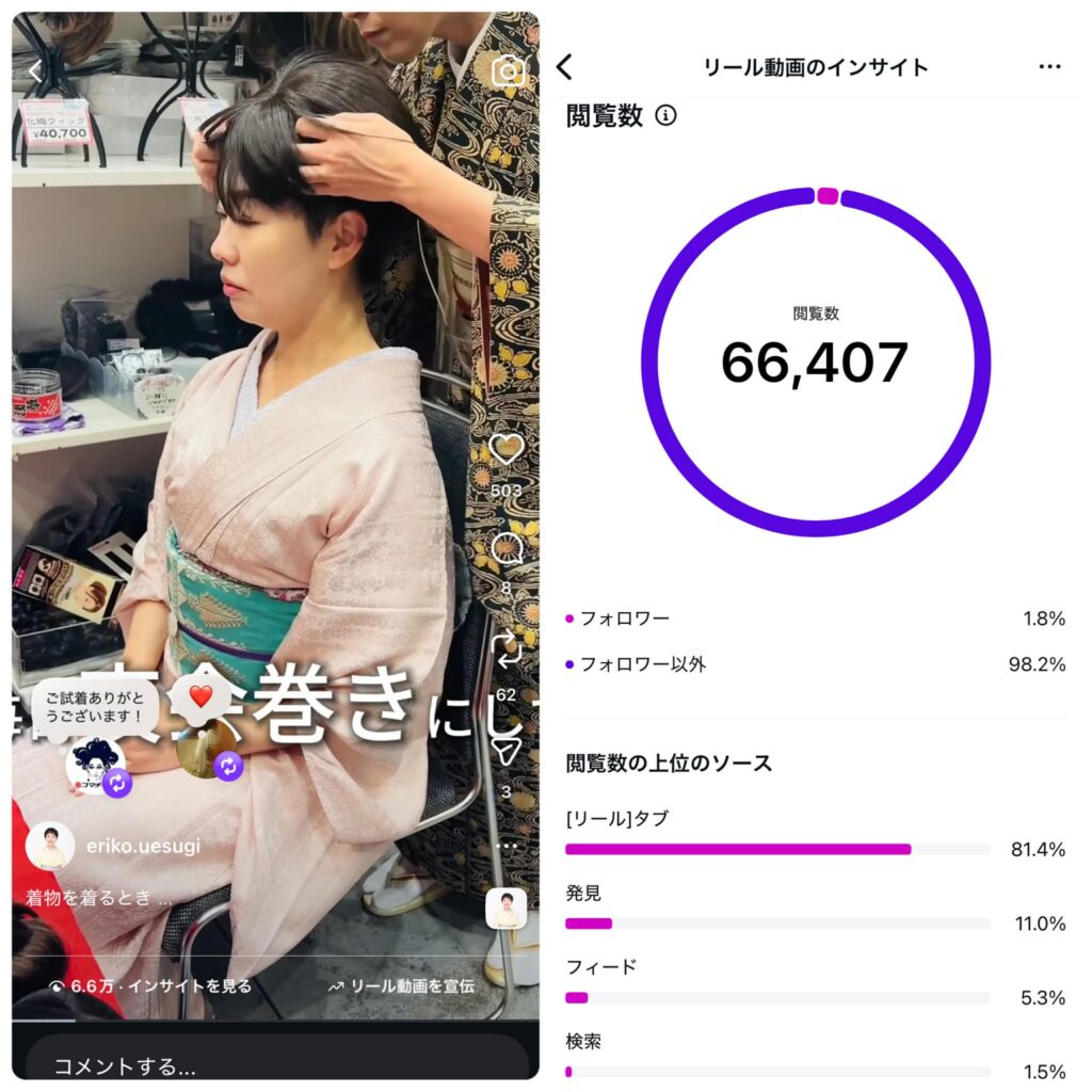 そうすると、今は通常の投稿よりもリール動画の方が「外」の人に見てもらえるんだ…とわかりやすすぎる結果です。